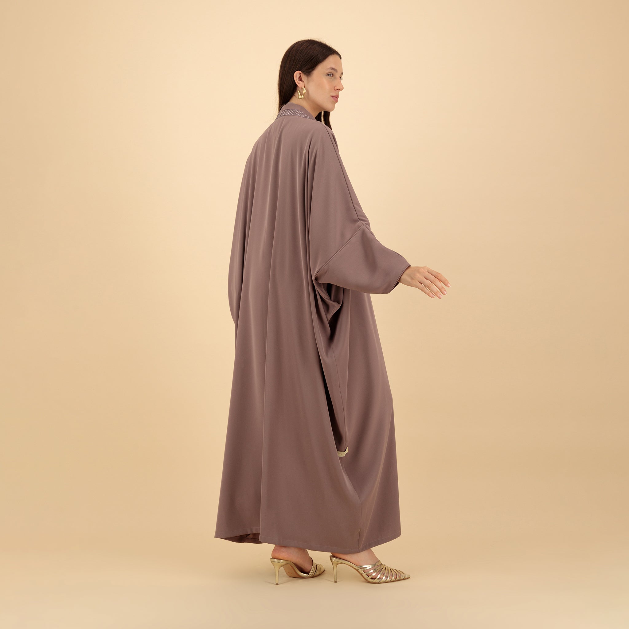Refined and contemporary, this mauve open abaya features understated trim detailing along the front edges for a hint of texture and contrast. The relaxed fit and flowing silhouette offer comfort and versatility, making it a chic choice for both casual and elevated looks.